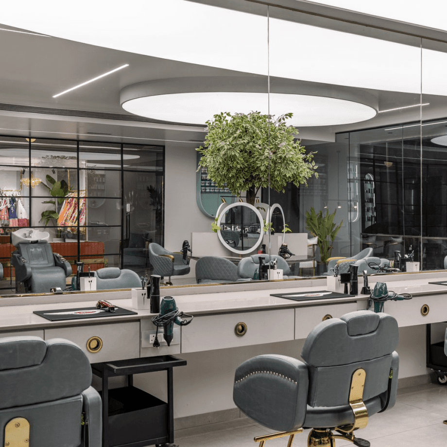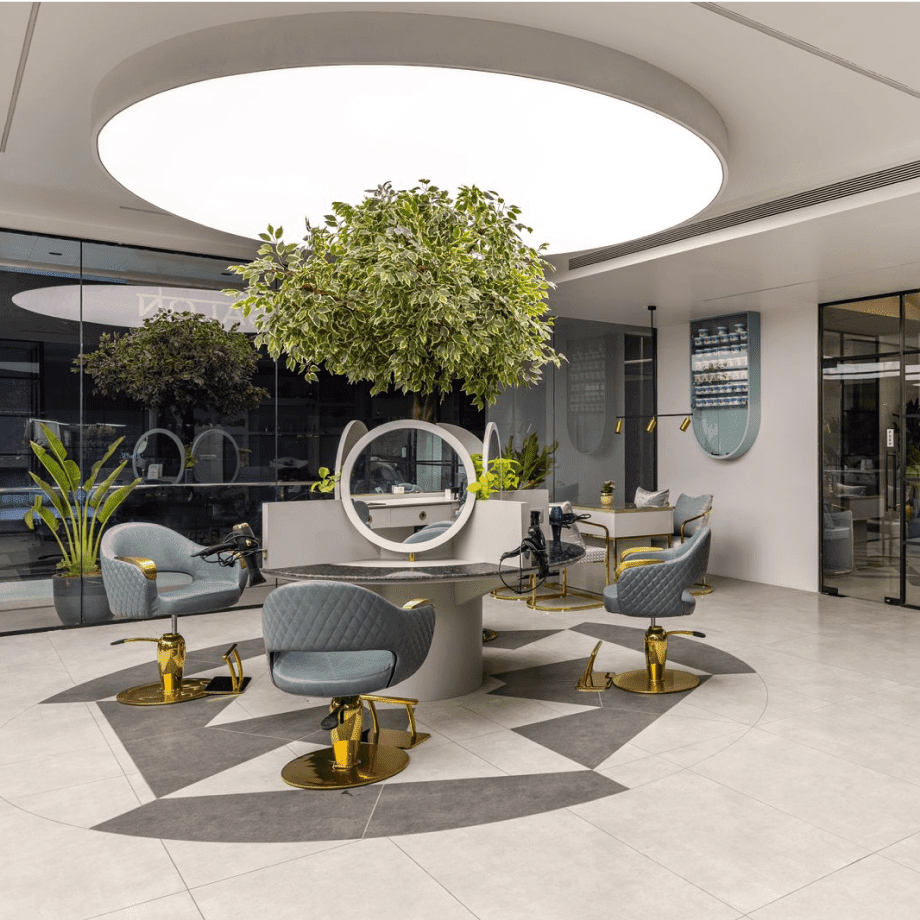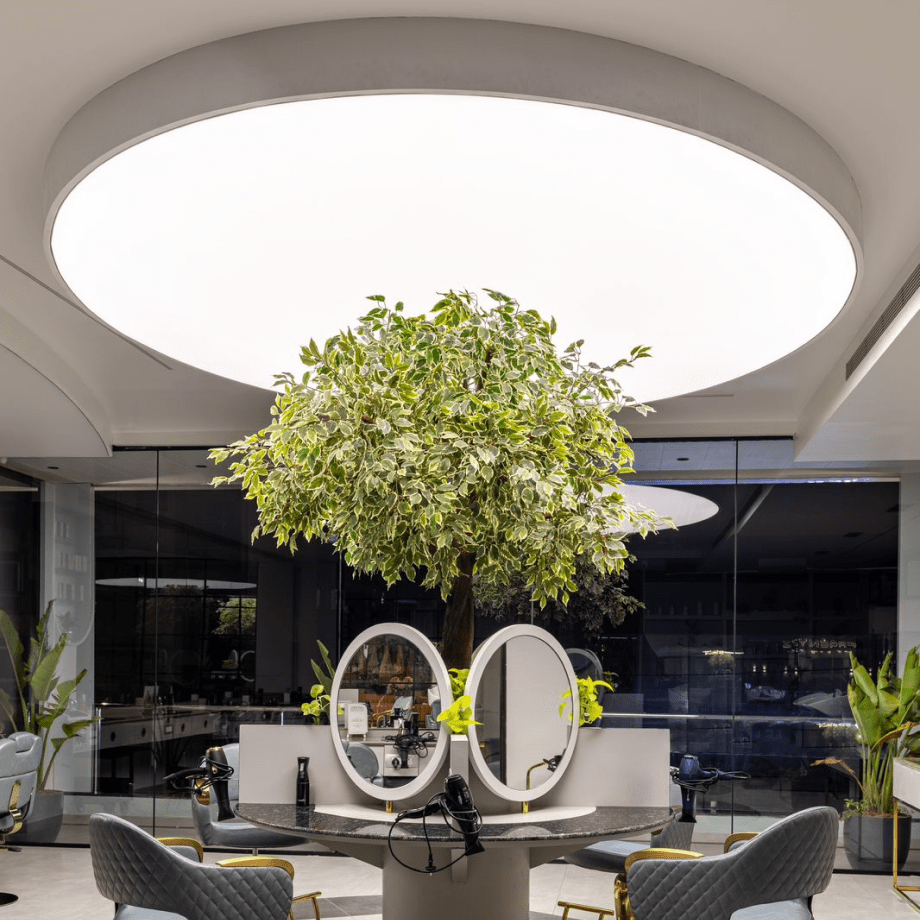 Project Details: Frenyz Salon in Vadodara, Gujarat, India has used NEWMAT Stretch Ceilings to create a stylish and modern look in their salon. A circular ceiling with a large live tree is placed at the center of the space to add a traditional touch to the salon (Traditionally, Indian barbers set their shops up under large trees.). Another large ceiling acts as the source of volumetric light to help the hair stylists get a shadow free experience while working with their clientele. The third ceiling is the make-up room, where the tunable light source helps the clientele visual their attire and make-up in every type of lighting.